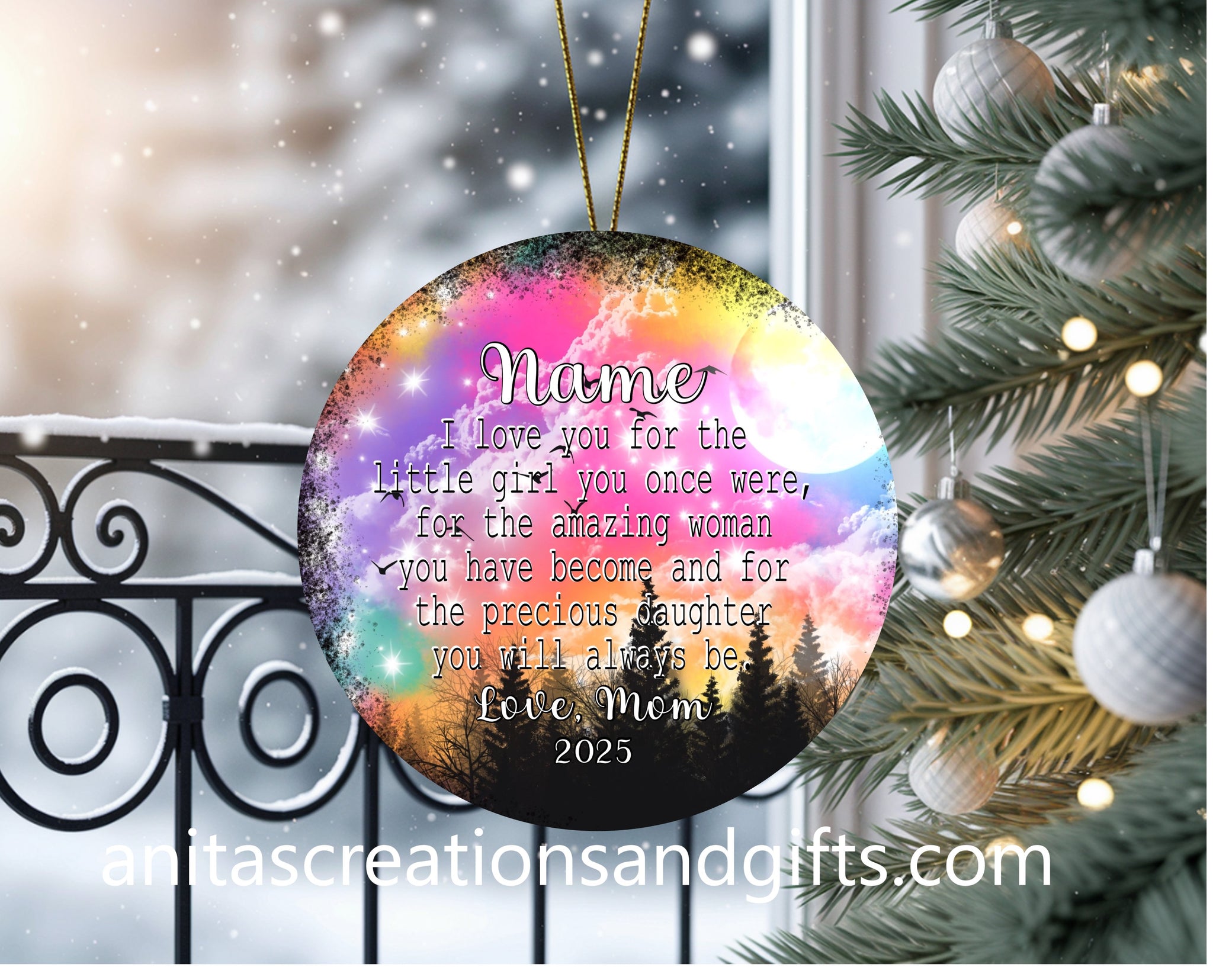 Celebrate your daughter with this charming ornament that captures the joy she brings to your life. Perfect for hanging on the tree or displaying year-round, this delightful keepsake makes a thoughtful gift that she'll treasure for years to come. Whether it's her first Christmas or a cherished addition to her collection, this ornament is a sweet way to honor the special bond you share and create lasting holiday memories together.